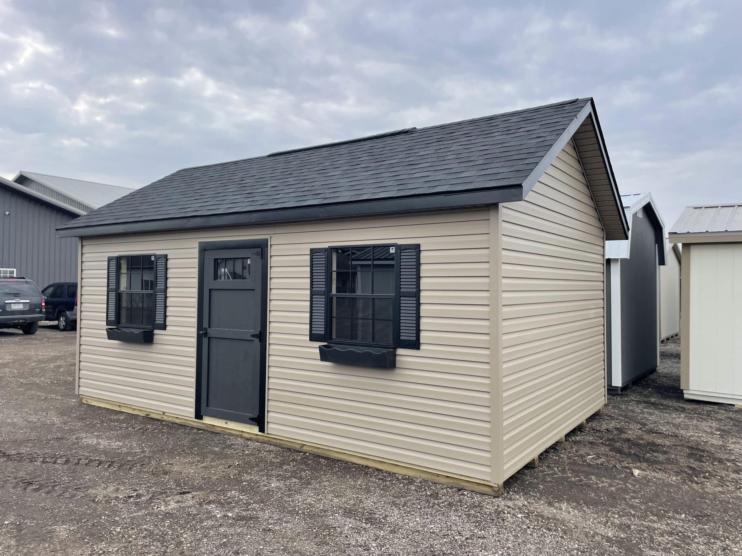 Upgrade your backyard with this 12×20 Cape Cod shed, featuring striking black trim and durable khaki siding for a modern yet classic look. The shed is topped with a weather-resistant asphalt shingle roof, ensuring long-lasting protection from the elements. Enjoy plenty of natural light with two 30”x36” black-framed windows, plus three 2’ transom windows built right into the doors for extra style and brightness. Need more headroom? The higher walls—6 inches taller than standard—give you that spacious feel for storage, hobbies, or whatever your imagination dreams up.