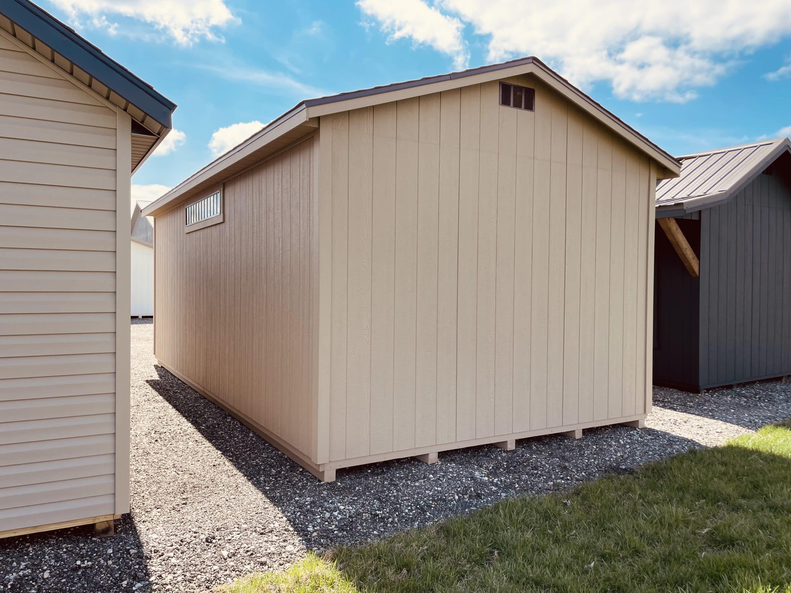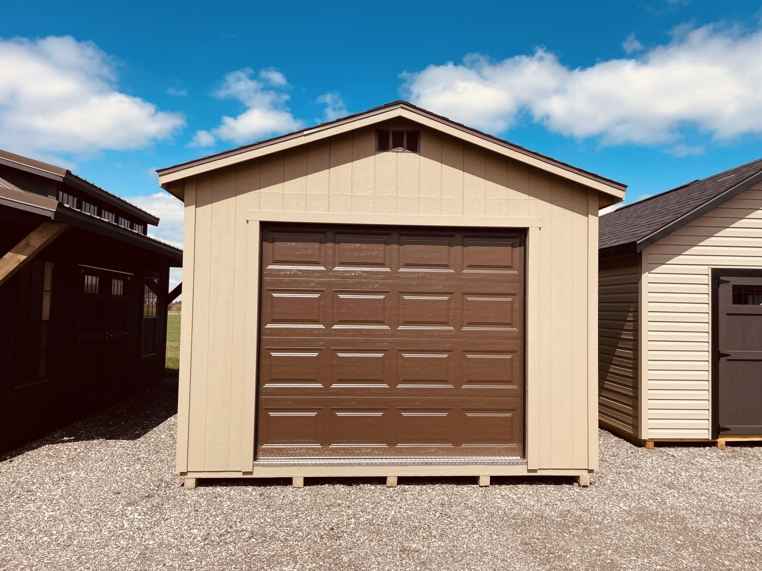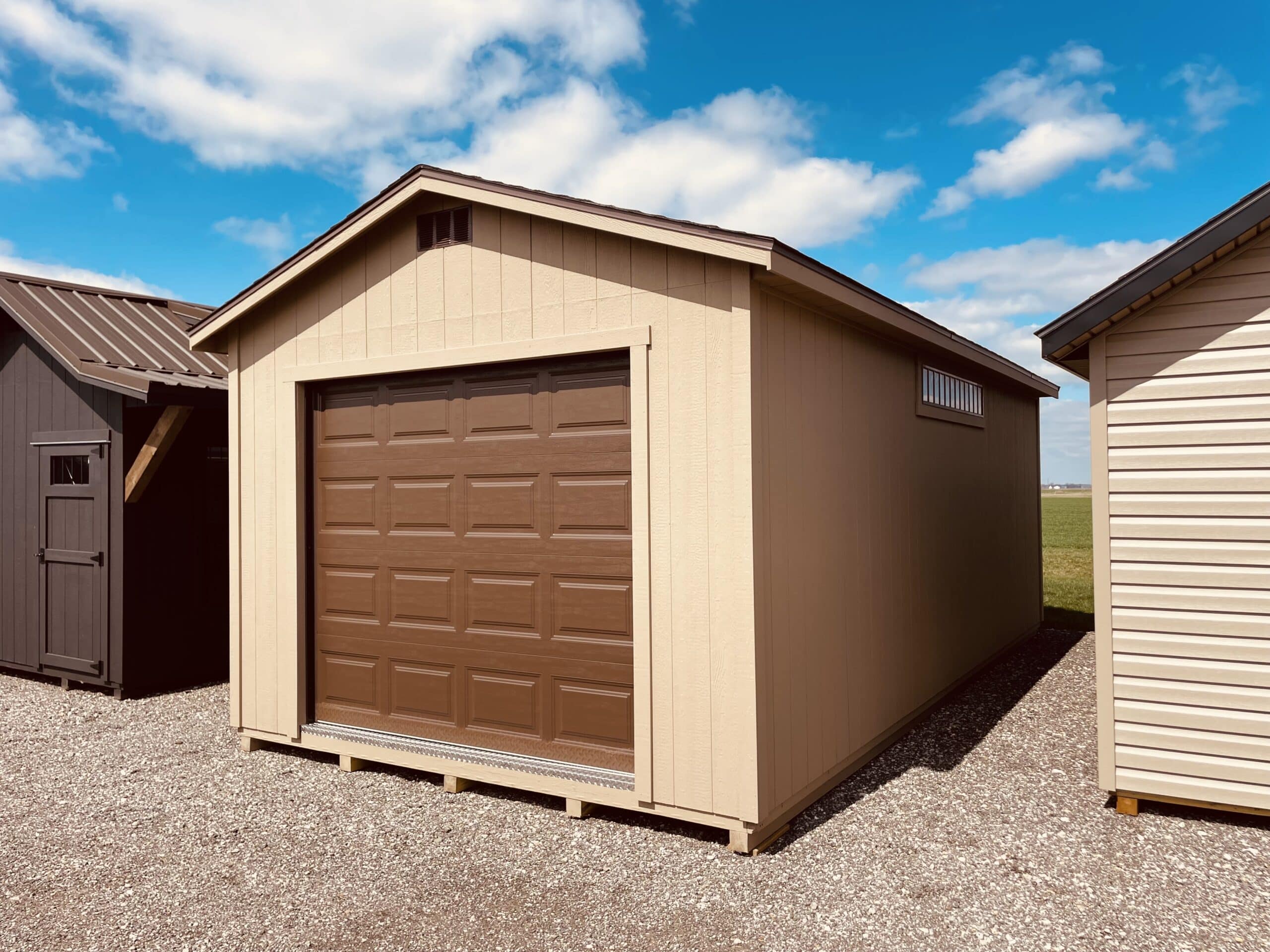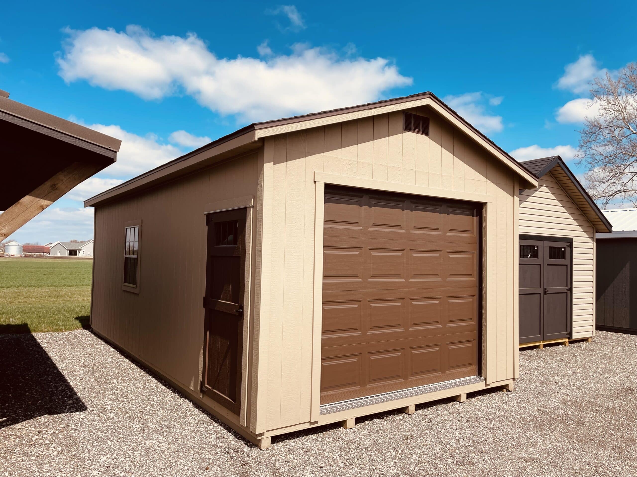 Upgrade your storage game with this 12×24 Gable Garage, featuring durable metal siding in a stylish khaki finish and a classic asphalt shingle roof. An 8’ x 7’ brown overhead door will be installed soon for easy access, while the 2” x 8” treated floor provides a solid foundation for all your gear. Enjoy natural light from a 30” x 36” brown window, a 2’ transom window in the door, and a 6’ transom window in brown. Higher 8′ walls offer extra headroom, and a 6-foot loft gives you bonus storage space for those items you want out of the way but close at hand. Perfect for anyone who needs a little more room—and a lot more style—in their backyard.