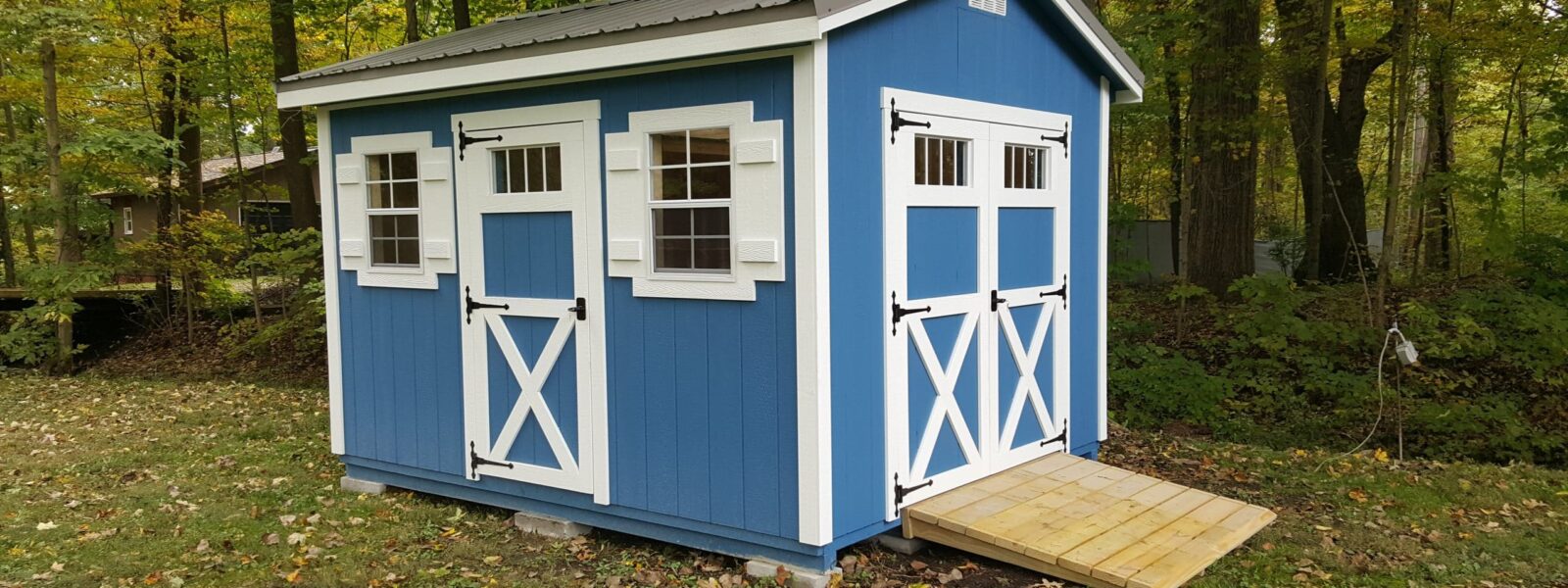 The Quaker Garden Shed has a unique design that provides a significant overhang for rain protection while opening doors. This style is an excellent option for backyard storage or custom-building uses like home offices, she sheds, etc..… These are available in inventory or for custom-built storage sheds in the Columbus area.