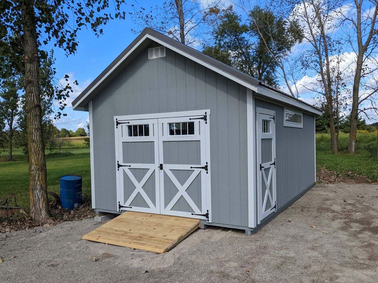 This is a beautiful Cape Cod storage shed that we installed in Delaware, Ohio near Columbus. This customer opted in for some really nice upgrades including a wooden ramp, a transom window on the side, an extra side entry door, and all doors were upgraded to our standard double wooden doors with transom windows. This 12×20 storage shed was prebuilt, delivered to Delaware, and installed on a gravel pad. If you want to design your own shed, take a look at our 3-D builder. If you want to take advantage of getting a shed quickly, take a look at our available inventory.
