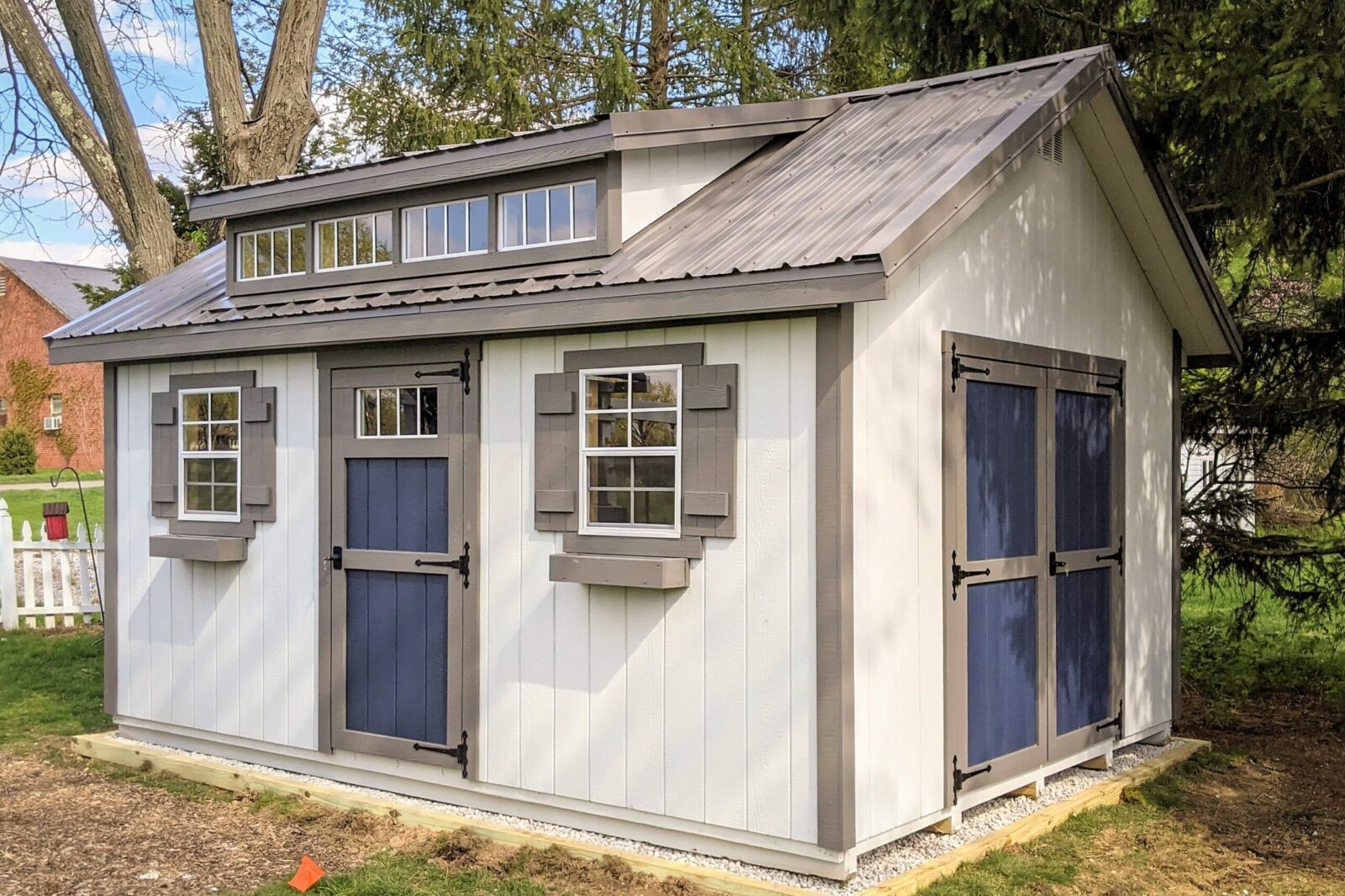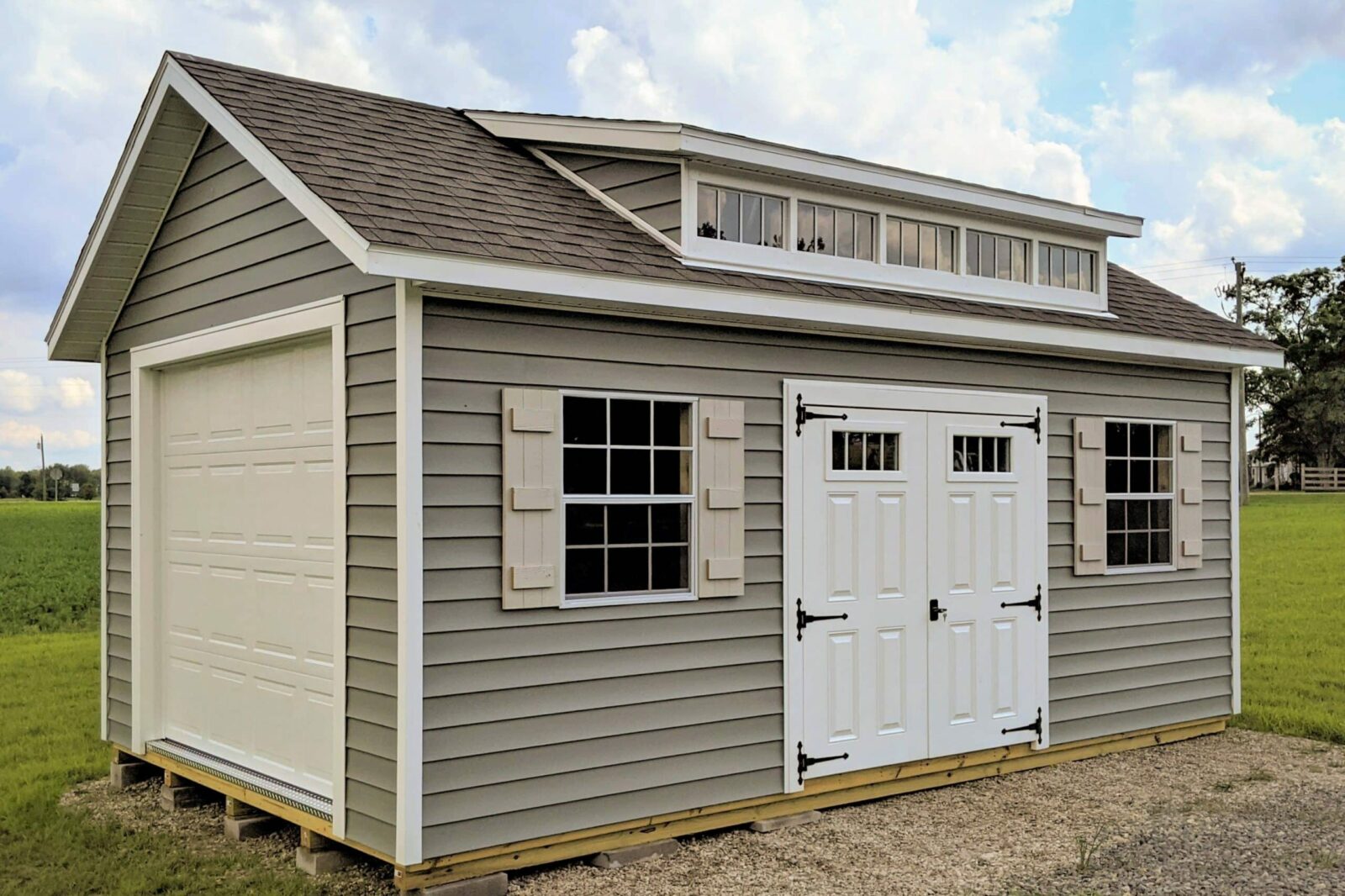 Are you looking for a unique backyard shed to add to your yard’s appeal? With its distinctive roof design that includes a dormer, the Cottage Shed is well-suited for even the classiest of neighborhoods. The windows in the dormer allow natural light to stream in, creating an airy ambiance. The steeper pitch on the roof is not only for an enhanced appearance, but also allows for extra storage space in the optional loft. Keyed alike single and double doors are included.