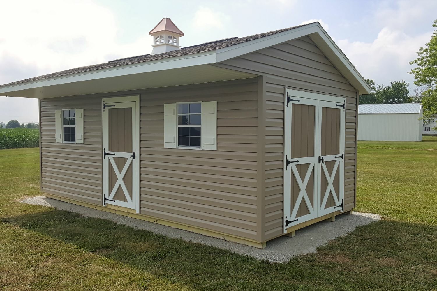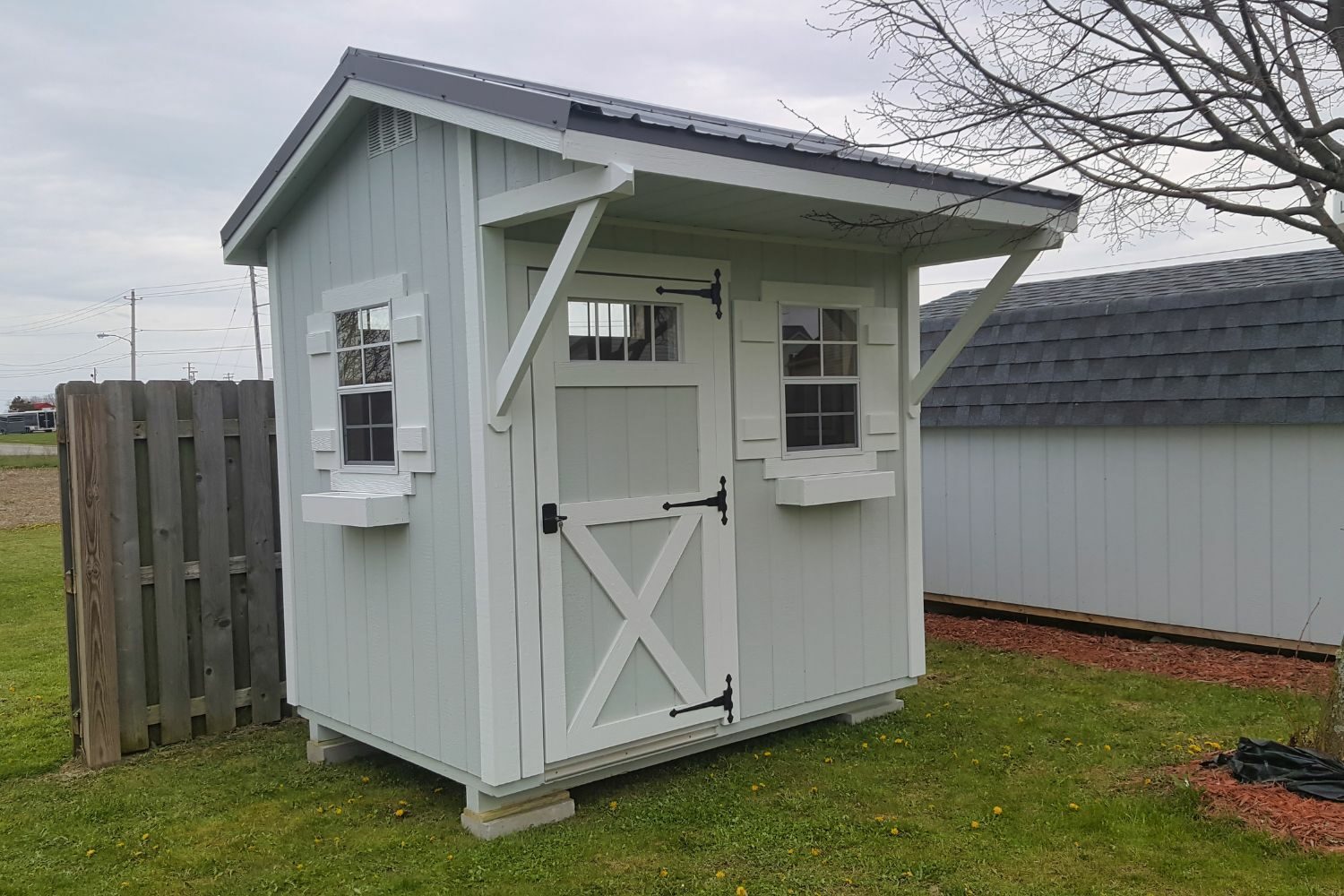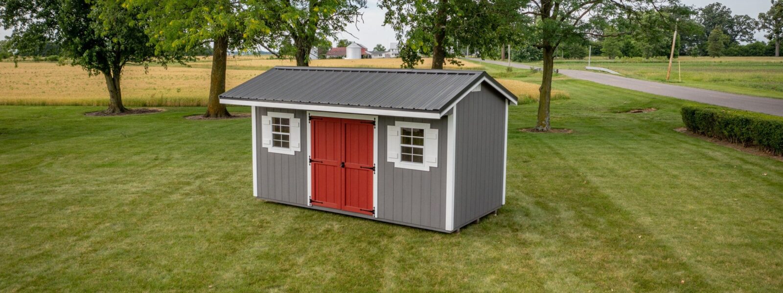 This attractive shed design gives a nod to the carriage sheds of the olden days. With a large overhang, the Quaker Sheds give you ample space to get out of the rain while opening the doors. The quaint design of this shed lends itself well to custom usages for home offices, she sheds, studio sheds, or man caves. Its layout allows for doors and windows to be placed on any wall of the building, making it a very customizable building. Take a look at our inventory of available Quaker Sheds today!